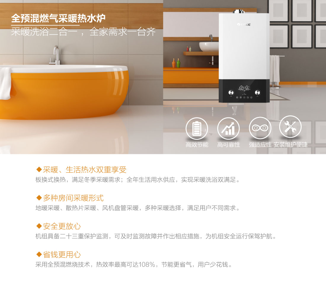 全预混燃烧结合双宽域功率调节,节能恒温,温差在±0.5℃之间,保证热水四季恒温快速出热水,减少水流浪费,生活水温度35-60℃,采暖水温30-80℃