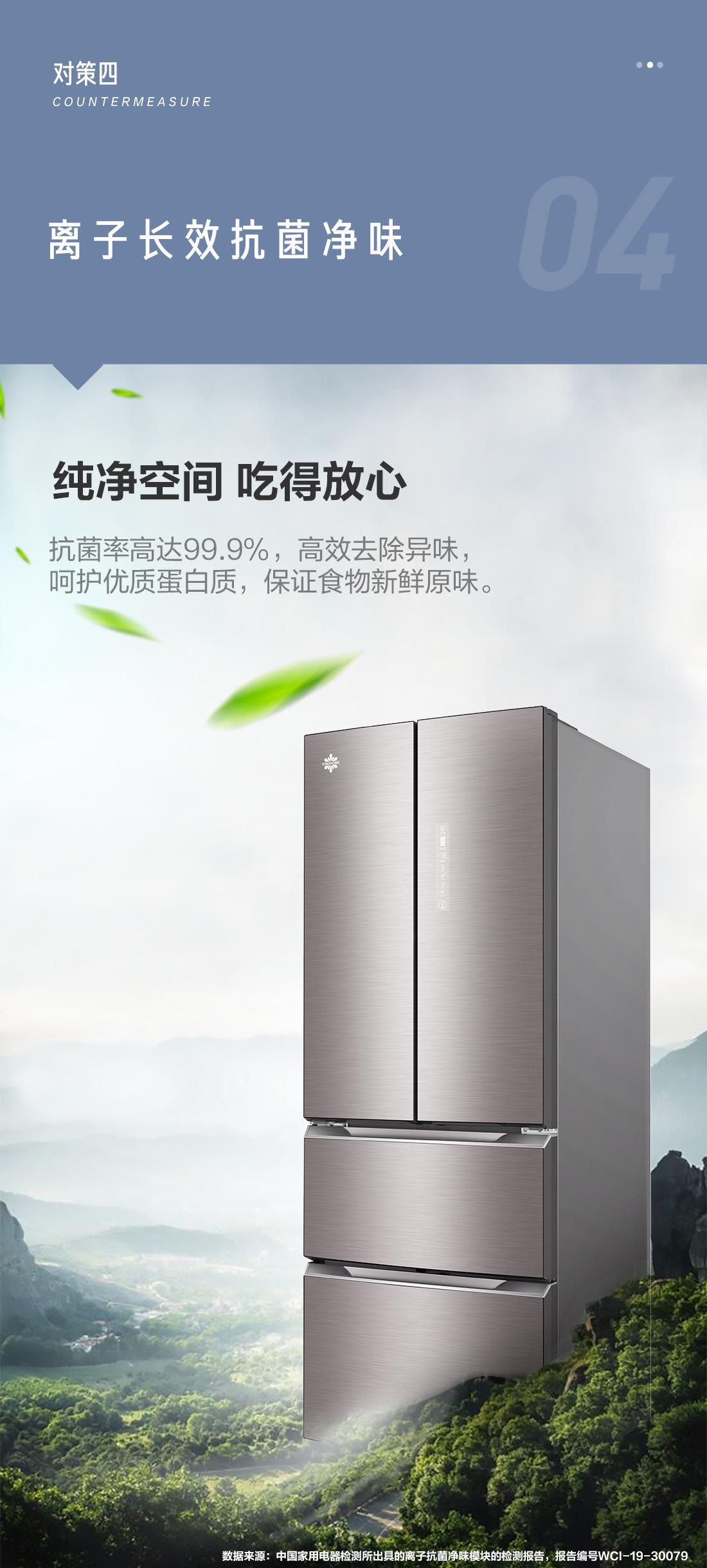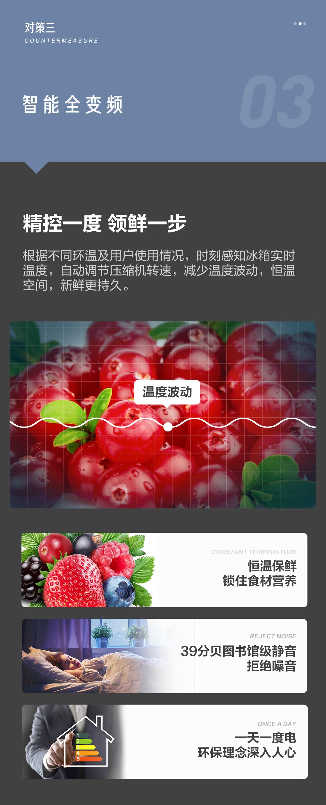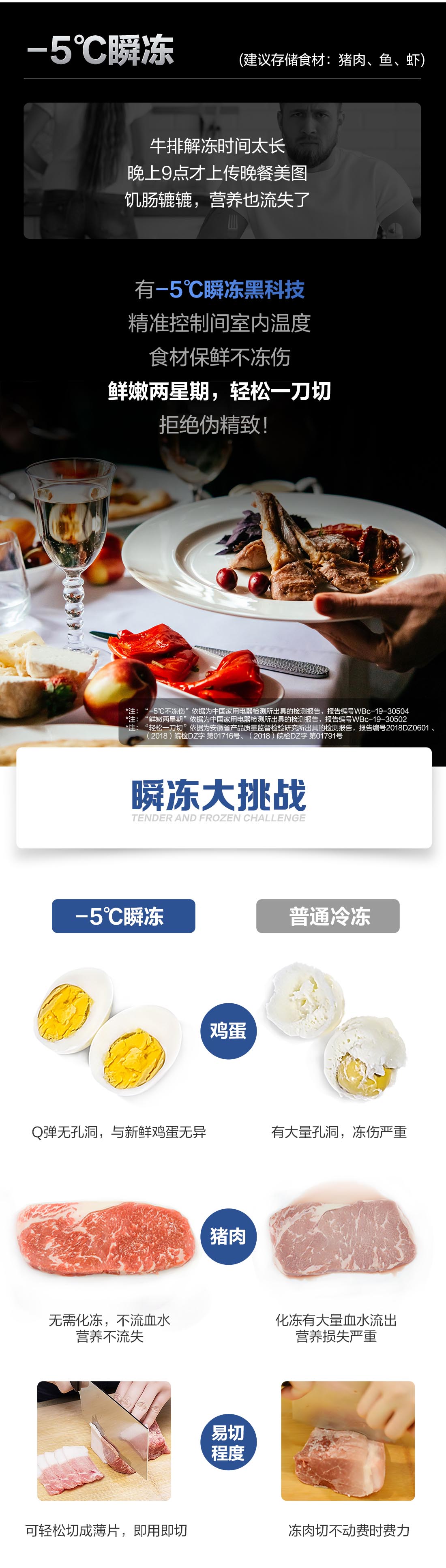 搭载-5℃瞬冻黑科技,鲜嫩两星期,轻松一刀切。细胞级养鲜,营养流失少。搭载-3℃嫩冻黑科技,食材不结冰,鲜嫩一整周。智能全变频技术,恒温保鲜,节能静音。