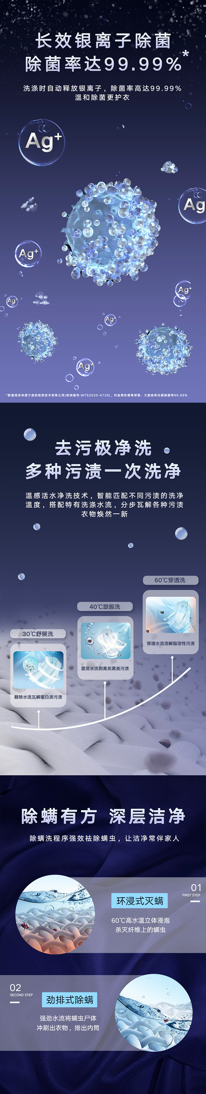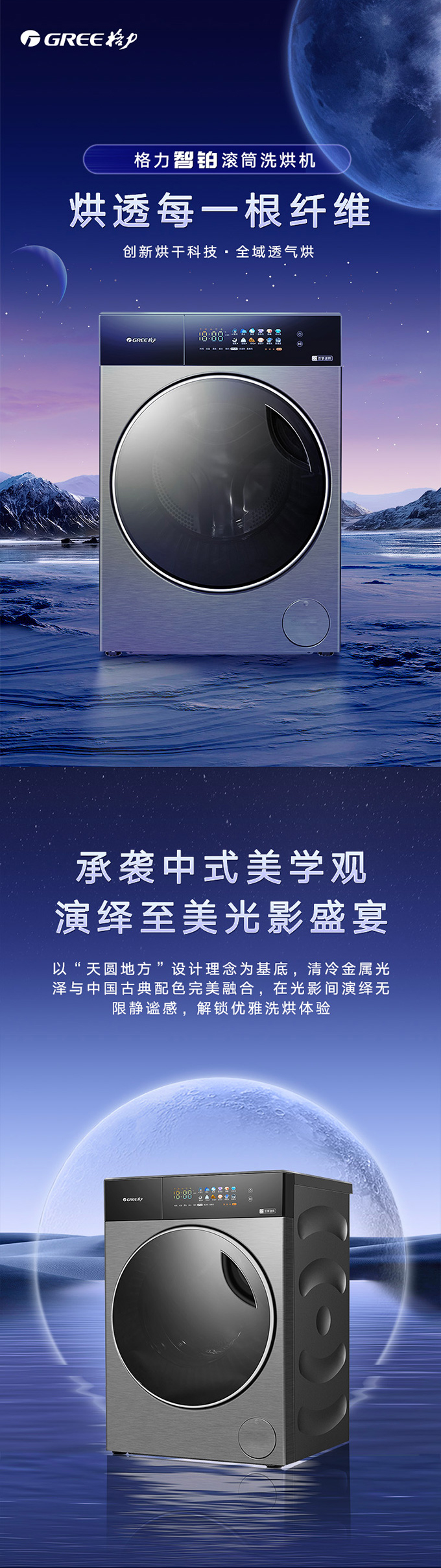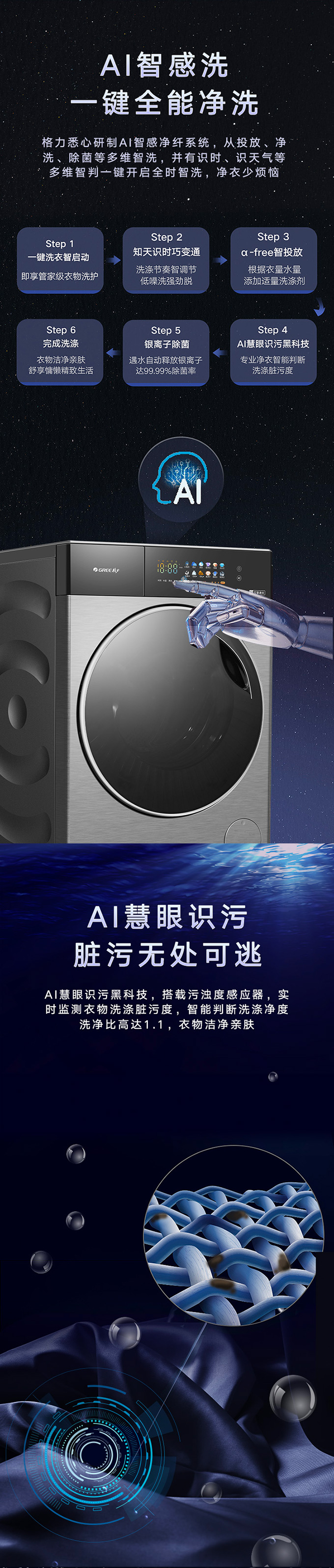 全域透气烘,衣物不在闷着烘。AI智能感应,脏污一键洗净。