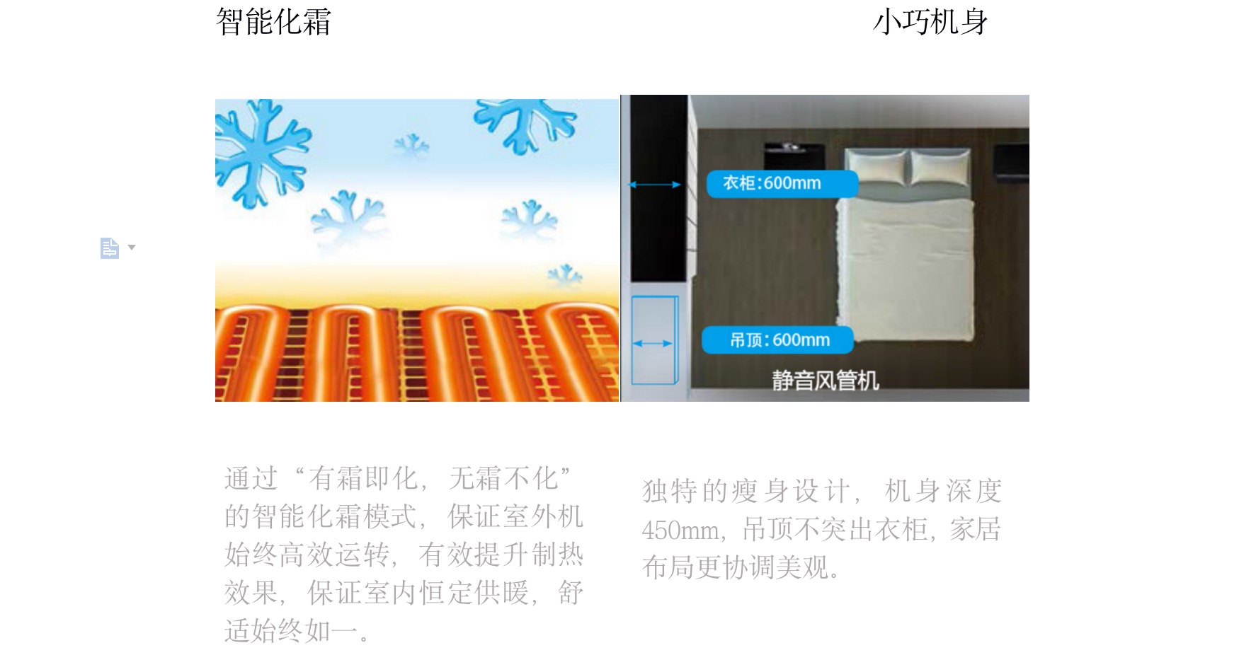 采用“V”型换热器,开机初期,根据室内温度与设定温度自动调节至高频状态,缩短制冷或制热时间,提升舒适度